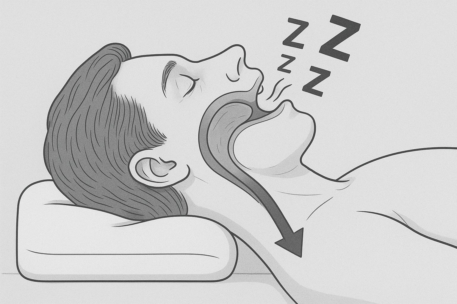 When we lie on our backs, the muscles in the throat relax. This can cause the tongue to fall back into the throat and partially block the airway.