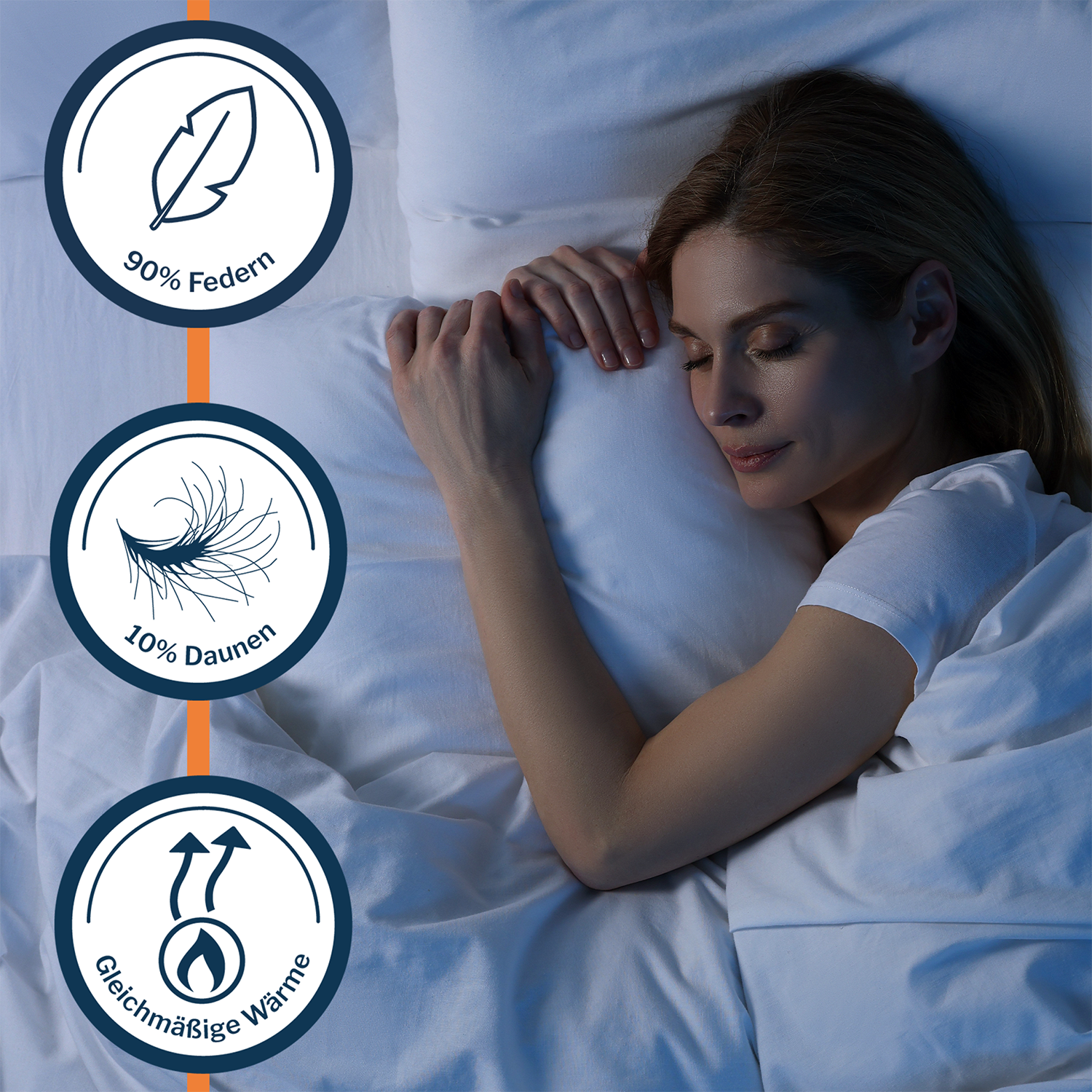 Mit einer großzügigen Füllung von 90% neuen feinsten Federn & 10% französischer Entendaunen bietet unsere Daunenbettdecke außergewöhnliche Flauschigkeit & Wärme für eine erholsame Nacht.