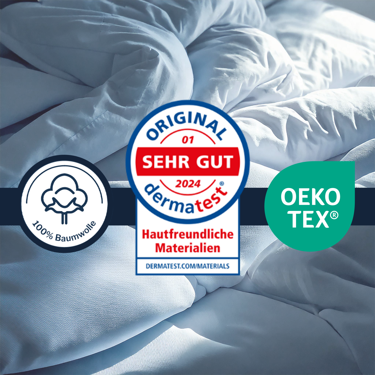 Unsere Daunen Bettdecke ist allergikergeeignet & bietet durch den 100% atmungsaktiven Baumwollbezug optimalen und unvergleichbaren Schlafkomfort.